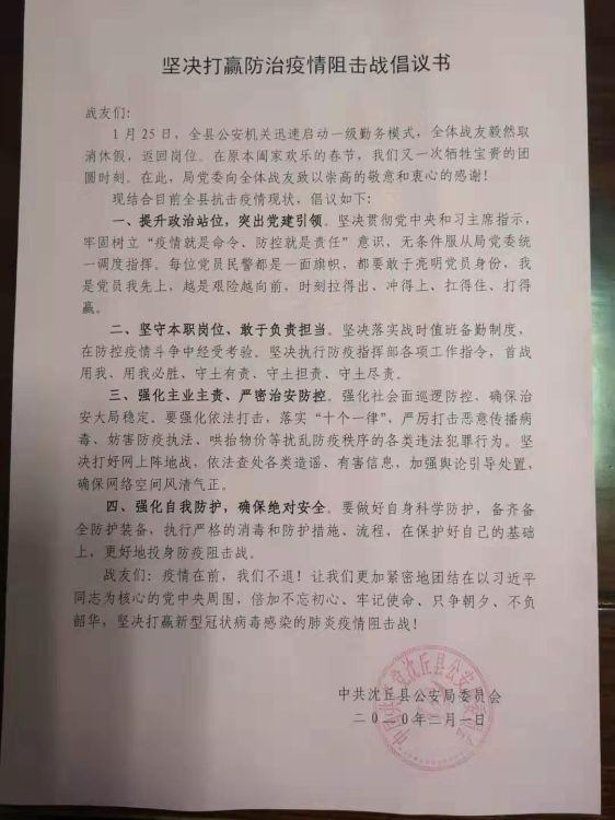 自全省啟動抗擊新型冠狀病毒引發(fā)肺炎疫情的一級響應后,沈丘縣公安機關迅速啟動一級勤務模式,在這場舉國同頻共振的防治疫情偉大斗爭中,突出戰(zhàn)時黨建引領,為堅決打贏疫情奠定了堅實的組織保障。