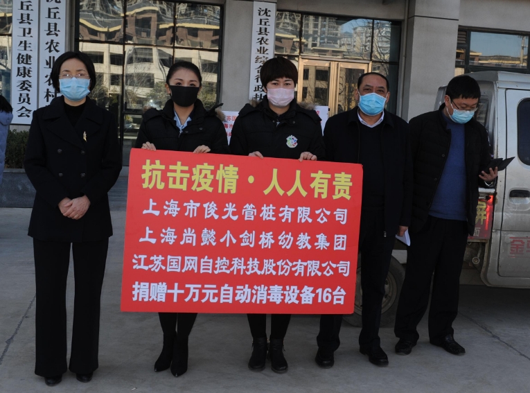 2月18日,在沈丘縣疫情防控指揮部,上海市俊光管樁有限公司、江蘇國網(wǎng)自控科技股份公司、上海上懿小劍橋教育管理有限公司聯(lián)合捐贈(zèng)價(jià)值10萬元的自動(dòng)消毒設(shè)備16套,沈丘縣洲業(yè)車業(yè)有限公司(洲業(yè)國際汽車城)捐贈(zèng)84消毒液(10升/桶)17桶、(5升/桶)166桶,沈丘縣華順農(nóng)業(yè)建設(shè)工程有限公司捐贈(zèng)75%酒精消毒液(非醫(yī)用)(2.5L/桶x6/件)168件、一次性使用醫(yī)用橡膠檢查手套(100副/盒)53盒,用于疫情防控工作。縣委常委、縣政府黨組成員馬偉,縣政協(xié)副主席、縣工商聯(lián)主席張瑛,縣政府辦副主任韓向立出席捐贈(zèng)儀式。
