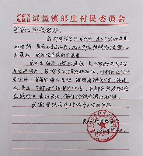 “龍九合同學積極勇敢,主動幫村民購買生活用品,努力學習疫情防護知識,對村民進行科普宣傳,冒著感染的風險給疫情隔離戶送生活用品、藥品,在我村疫情防控的戰(zhàn)役中表現(xiàn)突出,得到村鎮(zhèn)領導的稱贊,感謝學校給我們培養(yǎng)了一名好青年……”這是一封要寄往周口師范學院的感謝信,落款為鹿邑縣試量鎮(zhèn)郎莊行政村村民委員會。