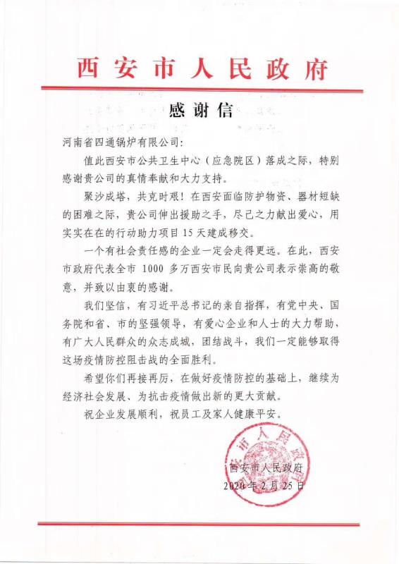 “聚沙成塔,共克時(shí)艱!在西安面臨防護(hù)物資、器材短缺的困難之際,貴公司伸出援助之手,盡己之力獻(xiàn)出愛心,在此西安市政府代表全市1000多萬西安市民向貴公司表示由衷的感謝”。這是西安市政府對太康縣拔尖人才、河南省四通鍋爐有限公司總經(jīng)理馮坤的感謝信。一方有難,八方支援。在新聞上了解到武漢新冠肺炎疫情突發(fā)的情況后,他連夜與中國紅十字會和武漢紅十字會取得聯(lián)系,詢問向新建的火神山醫(yī)院捐贈醫(yī)用鍋爐和捐款事宜,通過網(wǎng)上銀行將30萬善款轉(zhuǎn)入武漢紅十字會賬戶中。
