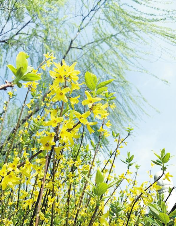 作為春天的信使,一叢叢嬌黃的連翹花,為大地帶來了濃濃春意。花朵在春風(fēng)的吹拂下?lián)u曳,團(tuán)團(tuán)簇簇,涌動(dòng)如金色波浪。走近之時(shí),聞花香淡雅、賞滿枝金黃,人們也以“報(bào)春花”來稱呼它。
