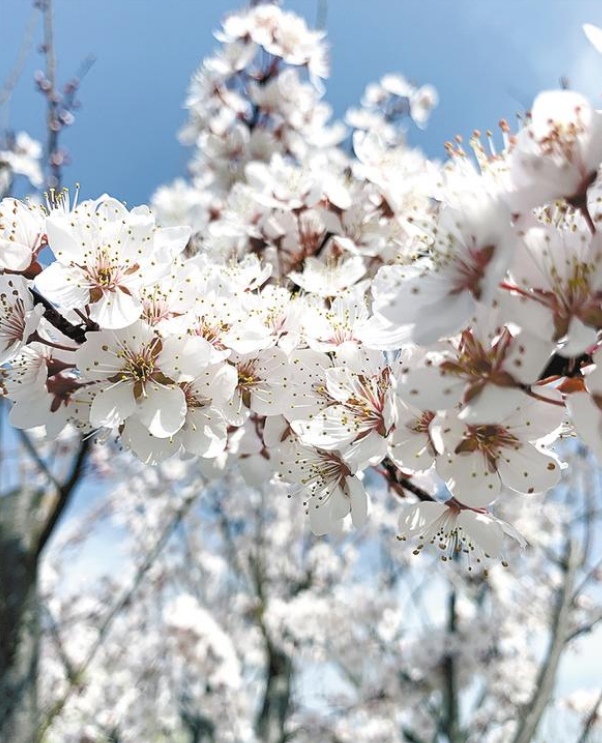 “一葉春風(fēng)吹動(dòng)蕾,紅葉李花妍漫天?!奔t葉李又名紫葉李,屬薔薇科。走近觀看,細(xì)細(xì)密密的粉白色繁花開滿枝頭,在紫色葉子的襯托下,顯得別致、靚麗。遠(yuǎn)遠(yuǎn)望去,像是爛漫層疊的櫻花,又宛如飄落大地的云霞,為春天平添幾分嫵媚、幾分浪漫。
