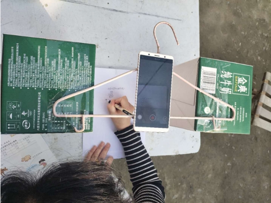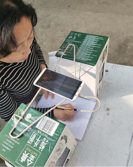 在備課時,朱霞很快遇到了難題:手機(jī)沒法固定,街上手機(jī)店又全部停業(yè),網(wǎng)上買的手機(jī)固定夾發(fā)不了貨。為了不耽誤學(xué)生上課,她想到用晾衣?lián)?、牛奶箱做成簡易支架,組裝后居然效果不錯。就這樣,一個晾衣?lián)巍蓚€牛奶箱和一部手機(jī)組成了她的“三尺講臺”。