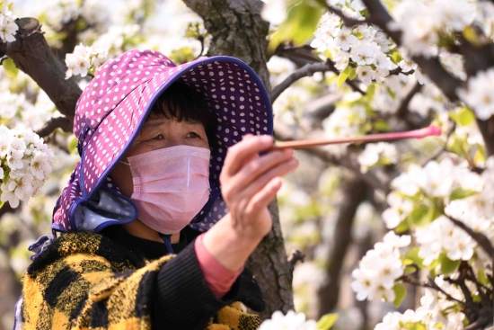 泛區(qū)農(nóng)場(chǎng)的萬(wàn)畝果園不僅吸引著游客觀光游覽,而且盛產(chǎn)的桃、梨、蘋果,品質(zhì)好,味道好,吸引著商家訂購(gòu),為果農(nóng)帶來(lái)可觀的經(jīng)濟(jì)收入。目前,給梨花授粉是果農(nóng)在花期中最重要的工作,上圖為果農(nóng)正緊張地給梨花授粉。