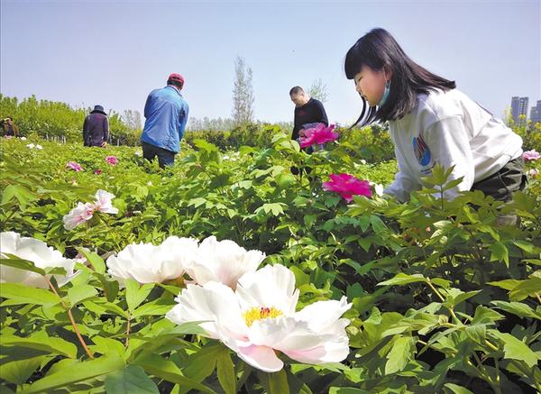 圖二 4月7日,在周口經(jīng)濟(jì)開(kāi)發(fā)區(qū)淮河路辦事處小牛莊的一個(gè)花圃內(nèi),千余株牡丹相繼吐蕊,吸引不少市民前來(lái)賞花。近年來(lái),我市不斷對(duì)中心城區(qū)進(jìn)行改建,著力提升城市的園林綠化水平,切實(shí)激發(fā)了城區(qū)周邊農(nóng)民種植花卉、草木的熱情。 記者 孫安平 攝