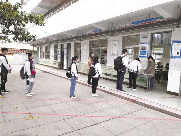 4月20日6時(shí)50分,記者在周口四中門口看到,學(xué)生們?cè)诩议L的陪伴下陸續(xù)趕來,按照學(xué)校提前下發(fā)的入校流程,在校門口間隔一米距離有序排隊(duì)。然后,他們按規(guī)定依次遞交健康承諾表后,在值班教師的引導(dǎo)下,通過大門兩側(cè)設(shè)置的體溫測(cè)試通道入校,每個(gè)通道處都有工作人員負(fù)責(zé)引導(dǎo)學(xué)生、噴灑消毒液。