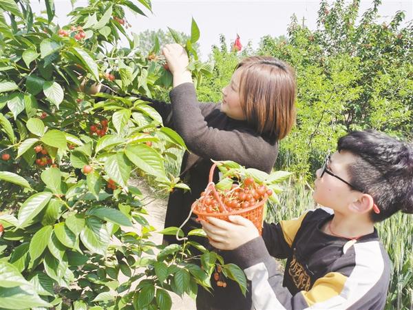 4月26日,在淮陽(yáng)區(qū)豆門鄉(xiāng)武灣村的櫻桃采摘園內(nèi),人們享受著采摘的樂(lè)趣。武灣村農(nóng)民利用地理優(yōu)勢(shì)種植櫻桃、草莓等,吸引附近的民眾前來(lái)采摘,成為當(dāng)?shù)氐奶厣a(chǎn)業(yè)。記者 孫安平 攝