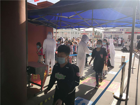 當日上午7時許,準備入校的項城市蓮溪小學(xué)學(xué)生在校門口值守老師及防疫人員的指揮下,排隊依次有序檢測體溫后,按照指定路線步入校園。為實現(xiàn)“科學(xué)有效防控,安全有序開學(xué)”,學(xué)校要求全校師生認真填寫“一碼一書”、嚴格實施“1米線”、堅持做到“晨午檢”。“孩子在這里很安全,我們很放心?!睂W(xué)生在蓮溪小學(xué)三年級就讀的家長袁先生說。