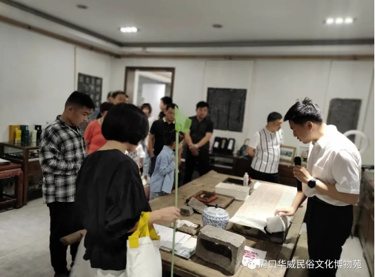 由于當(dāng)天是禮拜六,孩子們和大人來(lái)的特別多,陸陸續(xù)續(xù),穿梭不停,其中最大的一個(gè)游客團(tuán)由20多人,孩子們牽著大人的手,游百獅園,參觀華威綜合展廳的木質(zhì)榨油機(jī)和書畫,到華威學(xué)堂看拓片技藝,觀看香文化。