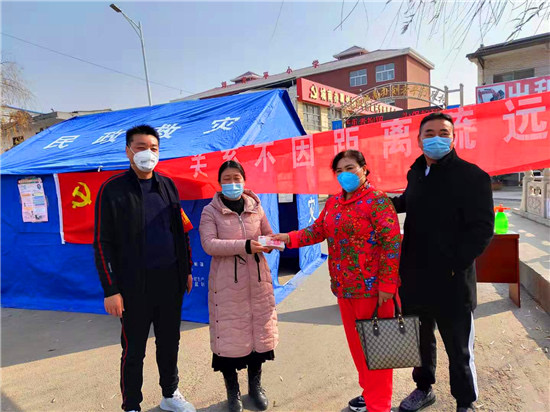防疫物資緊缺是開(kāi)展防疫工作面臨的共同難題。王七峰在防疫工作開(kāi)始后,第一時(shí)間向城南辦事處捐助資金5萬(wàn)元,并發(fā)動(dòng)親屬積極捐款,其三哥王永紅捐助資金2萬(wàn)元支持城南辦事處疫情防控工作,14歲的侄子王璽博也將自己的5000元壓歲錢(qián)捐了出來(lái),為抗擊疫情助力。之后,王七峰除了統(tǒng)籌村里的防疫工作外,每天早上6點(diǎn),還會(huì)準(zhǔn)時(shí)到村里各個(gè)防控點(diǎn)或巡查或值守,始終堅(jiān)守在排查登記、區(qū)域防控第一線。有了王七峰的帶頭表率,該村的干部、黨員、志愿者紛紛加入抗疫隊(duì)伍中來(lái),村民們也是有錢(qián)出錢(qián)、有力出力,大家眾志成城,有效落實(shí)了聯(lián)防聯(lián)控、群防群治的各項(xiàng)措施。