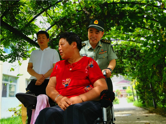 走進(jìn)位于太昊路上的周口市老年護(hù)理院,院內(nèi)整潔有序、花蕊吐香鳥鳴聲聲,小徑通幽處的涼亭內(nèi)三五老人打牌、聊天,一副愜意安詳?shù)纳顖?chǎng)景。在侯國領(lǐng)母親王玉勤居住的房間內(nèi),李揚(yáng)、孫光濤等人坐在床邊與她聊天談心,看到這么多人來慰問她,王玉勤眼中流下了感動(dòng)的眼淚,她對(duì)慰問人員表示感謝,說自己來護(hù)理院近一年來,吃住條件都不錯(cuò),護(hù)理院照顧的無微不至,身體一天天恢復(fù),閑暇時(shí)還能不依賴輪椅自己走上一段路。她激動(dòng)地說:“感謝黨和政府的親切關(guān)懷,我最大的愿望是希望倆兒子永遠(yuǎn)聽黨的話,在部隊(duì)安心服役、再立新功,用優(yōu)異的成績回報(bào)黨和政府對(duì)我們?nèi)业年P(guān)愛?!?/p>