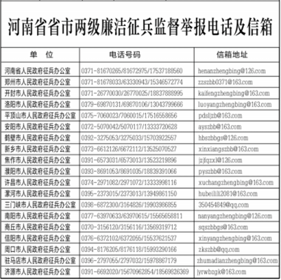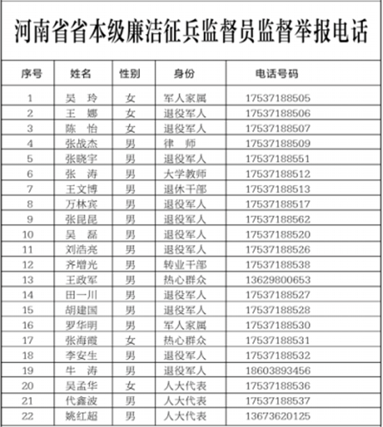 為扎實做好河南省廉潔征兵工作,切實維護廣大應征青年合法權益,確保為國防和軍隊建設輸送優(yōu)質兵員,現(xiàn)將省本級廉潔征兵監(jiān)督員和省市兩級廉潔征兵監(jiān)督舉報方式予以公示,歡迎社會各界對征兵工作予以監(jiān)督。征兵工作政策法規(guī)請關注“河南征兵”微信公眾號。