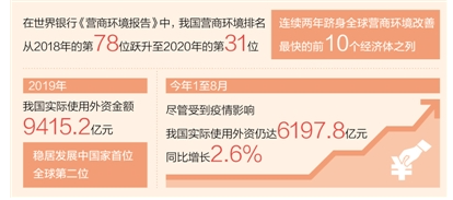 “十三五”期間,我國(guó)持續(xù)深化體制機(jī)制改革,全方位擴(kuò)大對(duì)外開放,降低準(zhǔn)入門檻,提升服務(wù)質(zhì)量。在世界銀行《營(yíng)商環(huán)境報(bào)告》中,我國(guó)營(yíng)商環(huán)境排名從2018年的第78位躍升至2020年的第31位,連續(xù)兩年躋身全球營(yíng)商環(huán)境改善最快的前10個(gè)經(jīng)濟(jì)體之列。