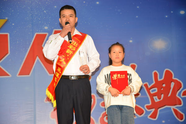 “節(jié)約能手”掘進(jìn)一隊(duì)職工師振東在頒獎(jiǎng)臺(tái)上接過(guò)12歲女兒頒發(fā)的獎(jiǎng)杯后,還得到了“小棉襖”的熱情擁抱。