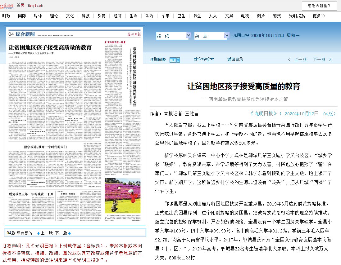 今天(2020年10月12日)出版的《光明日報》綜合新聞版,以頭條顯著位置刊登《讓貧困地區(qū)孩子接受高質(zhì)量的教育——河南鄲城把教育扶貧作為治根治本之策》,對鄲城教育成果進行了詳細而深入的報道,這里全文轉(zhuǎn)載,以饗讀者——