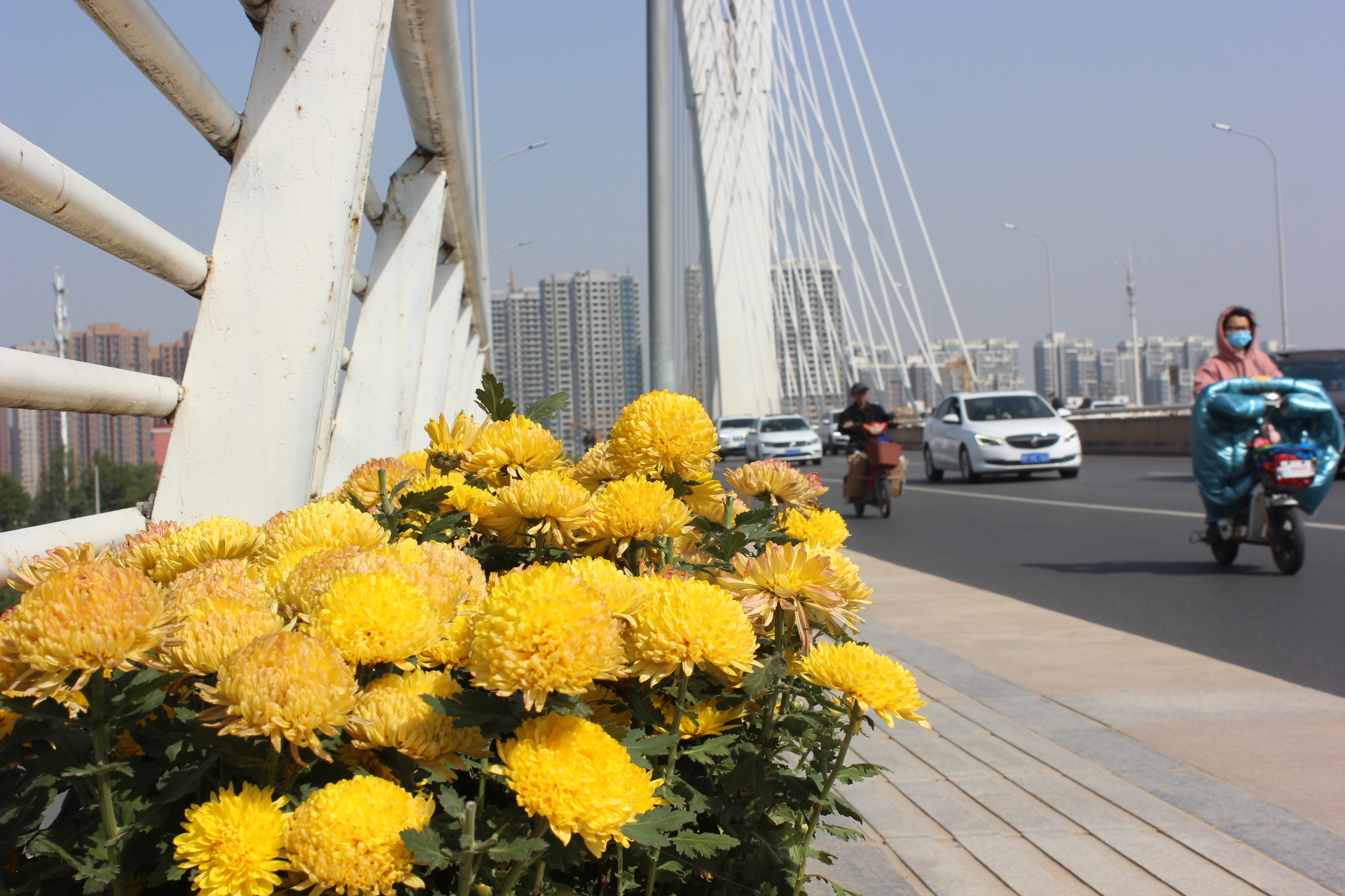 圖2 大慶路橋上金菊盛開(kāi)更顯秋季生機(jī) 見(jiàn)習(xí)記者 孫靖 攝