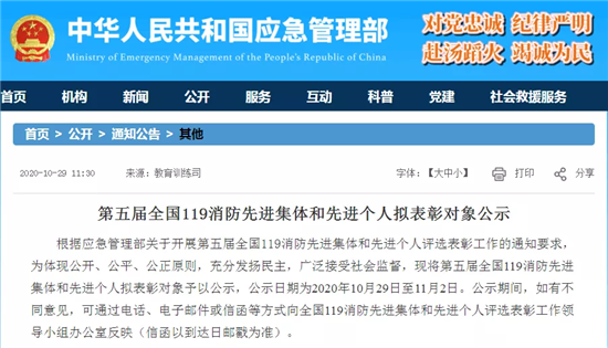 此次評選表彰工作堅(jiān)持公開、公平、公正的原則,按照自下而上、逐級推薦、民主擇優(yōu)的方式進(jìn)行,11月2日公示結(jié)束。據(jù)悉,這是首次將新組建的國家綜合性消防救援隊(duì)伍及其指戰(zhàn)員納入該獎項(xiàng)評選表彰范圍。