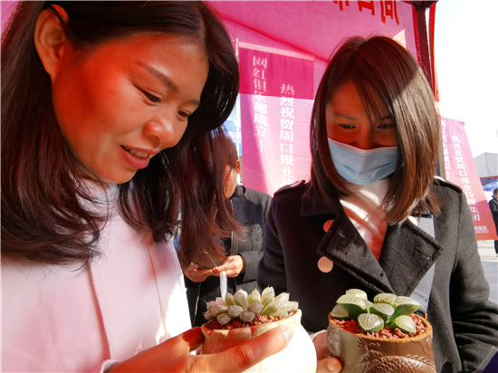 11月6日上午,周口市電商扶貧特色產品展銷會暨第一屆讀者節(jié)系列文化活動剛開始,鄲城多肉盆栽、扶溝縣農特產、沈丘縣顧家花饃等周口特產展位前人頭攢動。此次活動聚集了周口特色優(yōu)質農產品,吸引不少市民。