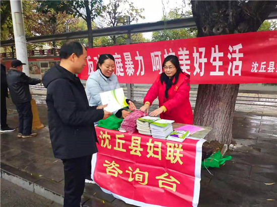 11月25日是國際反家庭暴力日。為進一步提高全社會反家庭暴力意識,加大對《反家庭暴力法》的宣傳,有效預(yù)防和制止家庭暴力,促進家庭和諧,保障婦女群眾在婚姻家庭中的合法權(quán)益。為此,沈丘縣婦聯(lián)在城區(qū)組織開展了以“反對家庭暴力,呵護美好生活”為主題的法治宣傳活動。