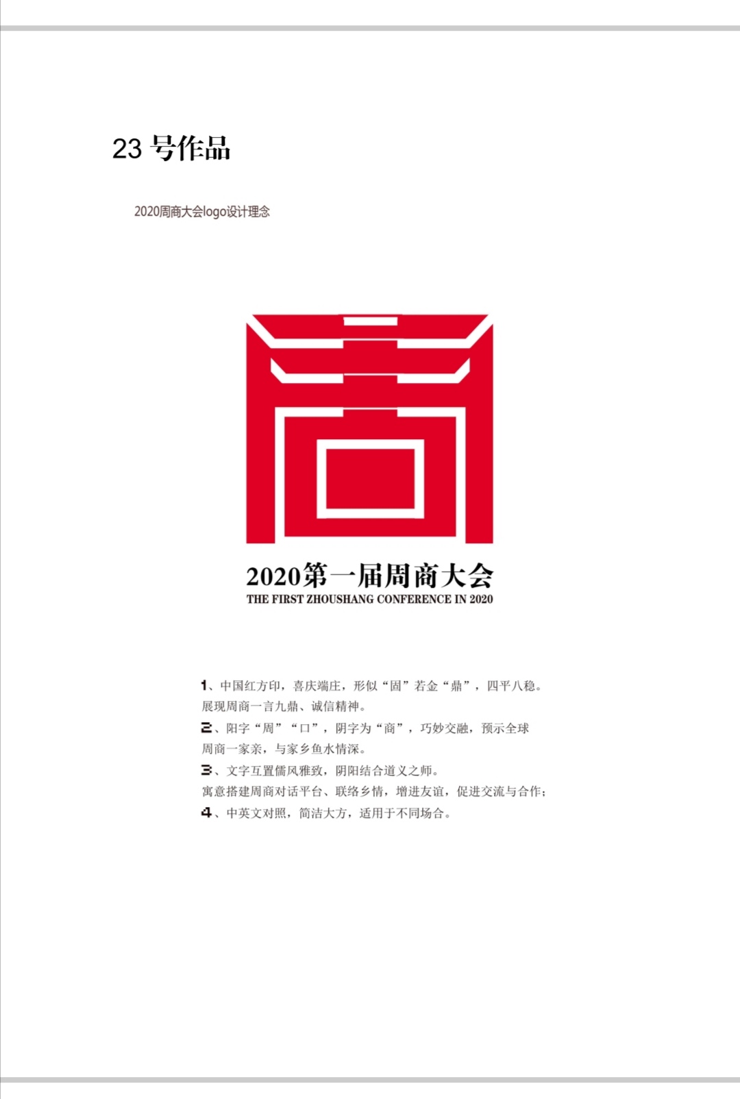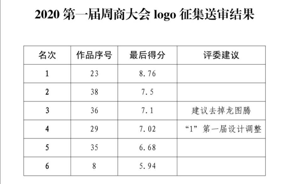自11月12日起面向社會公開征集第一屆周商大會主題會標(biāo),截至11月19日24:00時,大會工作組共征集到來自10個省轄市的作品67件。11月20日上午10:00時,對作品進(jìn)行統(tǒng)一編號后,經(jīng)專家評審團(tuán)評審出55幅進(jìn)入評選,經(jīng)逐項打分初評出6件作品,最后按綜合得分前三名作品入圍。