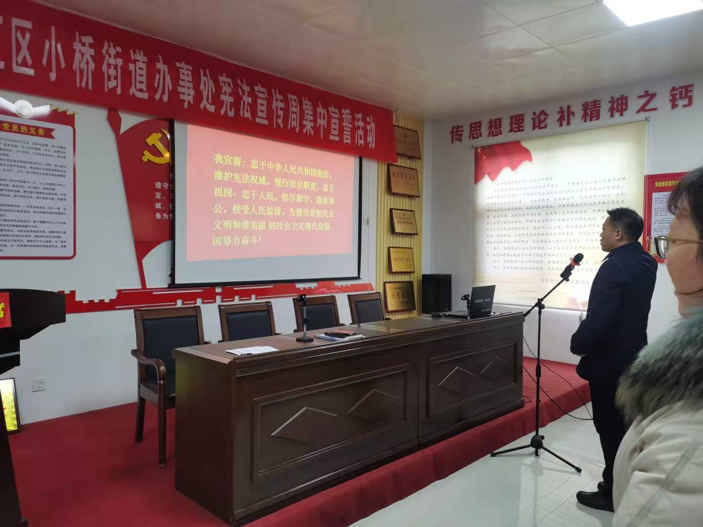 國歌響起,全體人員起立唱國歌。隨后,小橋街道辦事處黨工委書記侯明亮左手撫按憲法,右手舉拳,領誦誓詞,其他宣誓人跟誦誓詞。宣誓后,侯明亮對開展好憲法宣傳周宣傳活動、學習黨的十九屆五中全會精神和習近平總書記關于憲法的重要論述做了具體安排部署,要求大家要結合當前工作實際,做到依憲施政、依法行政,進一步提高尊法學法守法用法意識。