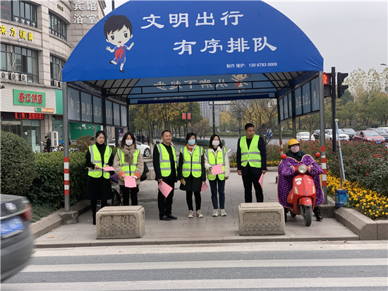 “您好,現(xiàn)在是紅燈,為了安全請等綠燈后再走。”“請再往后退一點,不要擋住汽車通道……”12月5日是第35個國際志愿者日,當(dāng)日上午8時,正值人流高峰期,在浙江省杭州市富陽區(qū)春江街道大橋路和春南路交叉口,志愿者崔守領(lǐng)一行人身著反光背心在該路口緊張忙碌著,勸導(dǎo)行人文明出行、安全出行,為冬日的杭州增添了一股股暖意。