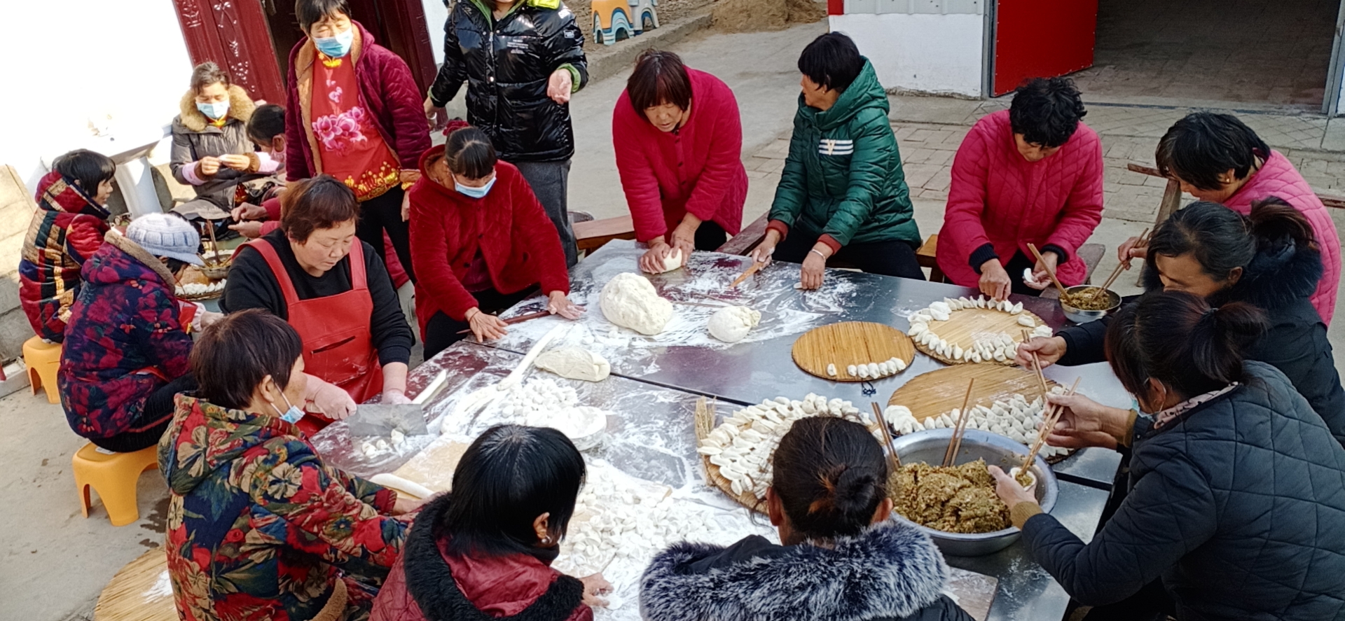 鄉(xiāng)村大食堂院子里,大家有說(shuō)有笑,圍在數(shù)平方米的巨大案板前,個(gè)個(gè)拿出了看家本領(lǐng),分工協(xié)作,揉面、搟皮、包餃子,個(gè)個(gè)動(dòng)作嫻熟,包起餃子來(lái)麻利干練,不知不覺(jué)間,面前的盤(pán)子里就擺滿了餃子。