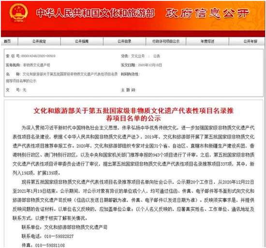 據(jù)了解,2019年,文化和旅游部開展了第五批國家級非物質(zhì)文化遺產(chǎn)代表性項(xiàng)目推薦申報(bào)工作。2020年,文化和旅游部組織專家對全國31個(gè)省、自治區(qū)、直轄市和新疆生產(chǎn)建設(shè)兵團(tuán),香港特別行政區(qū)、澳門特別行政區(qū),以及中央和國家機(jī)關(guān)部門推薦申報(bào)的943個(gè)項(xiàng)目進(jìn)行了評審。之后,第五批國家級非物質(zhì)文化遺產(chǎn)代表性項(xiàng)目評審委員會(huì)進(jìn)行了審議,提出第五批國家級非物質(zhì)文化遺產(chǎn)代表性項(xiàng)目名錄推薦項(xiàng)目337項(xiàng),其中,新列入198項(xiàng),擴(kuò)展139項(xiàng)。