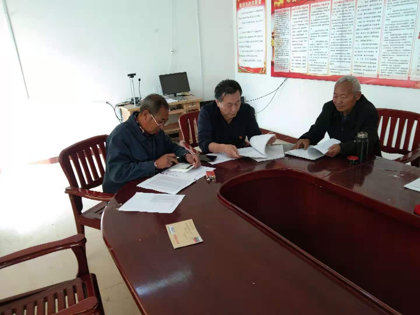 黃玉森(中)在村里工作。