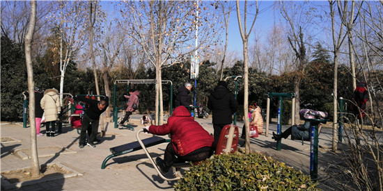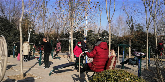 我市的街頭游園日趨增多,健身器材分布其中。1月13日,市民在街邊小游園內(nèi)的健身器材上鍛煉。(馬月紅)