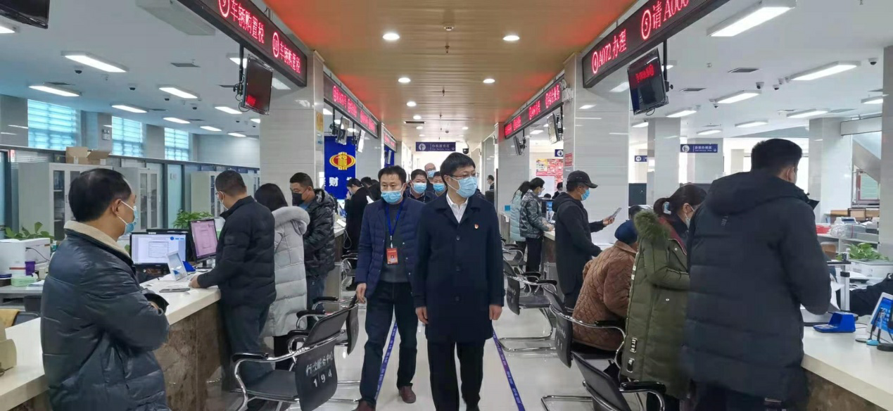 史凱歌、郝寶杰一行對政務(wù)服務(wù)大廳人員信息登記情況、人員管理、“一米線”落實等相關(guān)工作逐一進行檢查,并詳細了解每日辦件數(shù)量、通風消毒等措施落實到位情況。