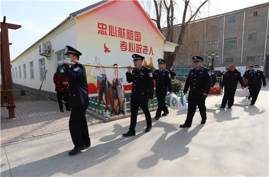 隨著春節(jié)日益臨近,該派出所所長楊杰和大家商議,“送溫暖送祝?!被顒樱瑧撓葟淖鹄蠍塾组_始。于是,民警們購買了60斤魚、100斤雞蛋和2袋面粉,利用中午休息時間來到敬老院,給老人們送上新春祝福。