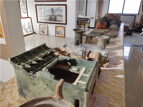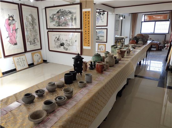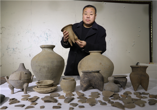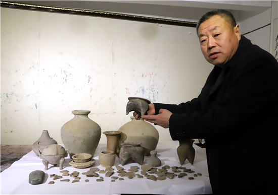 三足燉肉的陶鬲、圓形擦粉的粉盒、前方后圓的灶臺、帶孔過濾的茶罐、廣口大肚的糧罐、象形浮雕的方磚、雙耳大肚的水壺……1月31日,鄲城縣文聯(lián)副主席、收藏家協(xié)會會長閆振宇打開自己的“博物館”,將多年來在鄲城縣丁村鄉(xiāng)陶店村出土并收藏的數(shù)十件陶器向記者展示,以此進一步證明陶店遺址是龍山文化新時期石器遺址,疑為中國灰陶最早生產(chǎn)地,中國陶器之鄉(xiāng)。