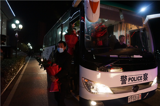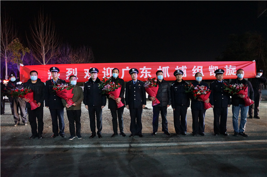 英雄凱旋,鮮花致敬。2月6日夜晚11時許,寧洛高速項城北收費(fèi)站警燈閃爍、隊列整齊,項城市公安局在這里隆重舉行儀式,熱烈歡迎 “1.8”專案組民警勝利歸來。副市長、公安局長萬東偉,局黨委副書記、副局長陳重,局黨委委員、政辦室主任衛(wèi)偉,局黨委委員袁啟峰等領(lǐng)導(dǎo)出席儀式,部分民警代表參加了儀式。萬東偉同志代表局黨委對此案的成功偵破表示熱烈祝賀,真誠感謝專案組民警的辛勤付出,并向大家致以崇高的敬意。