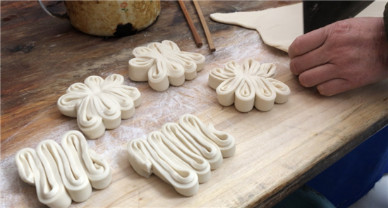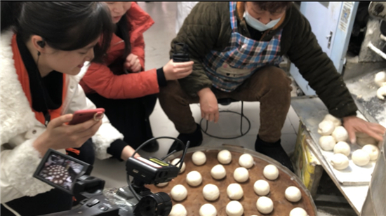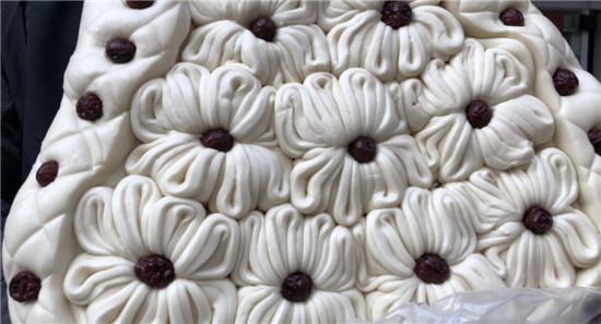 除了平常的白面饅頭,黃師傅還讓妻子現(xiàn)場(chǎng)展示了“棗山”制作,并介紹了棗山的寓意和習(xí)俗。“你看這棗山是一層一層的,寓意著步步登高,而且棗山的花形是圓的,代表著團(tuán)團(tuán)圓圓。過去出嫁的閨女過年回娘家要帶大饃,娘家要回棗山,現(xiàn)在咱們周口的一些地方還保留著這樣的習(xí)俗。”兩位主播體驗(yàn)了棗山的制作過程,得到黃老板妻子的夸獎(jiǎng):“中!這倆妮兒可巧!”