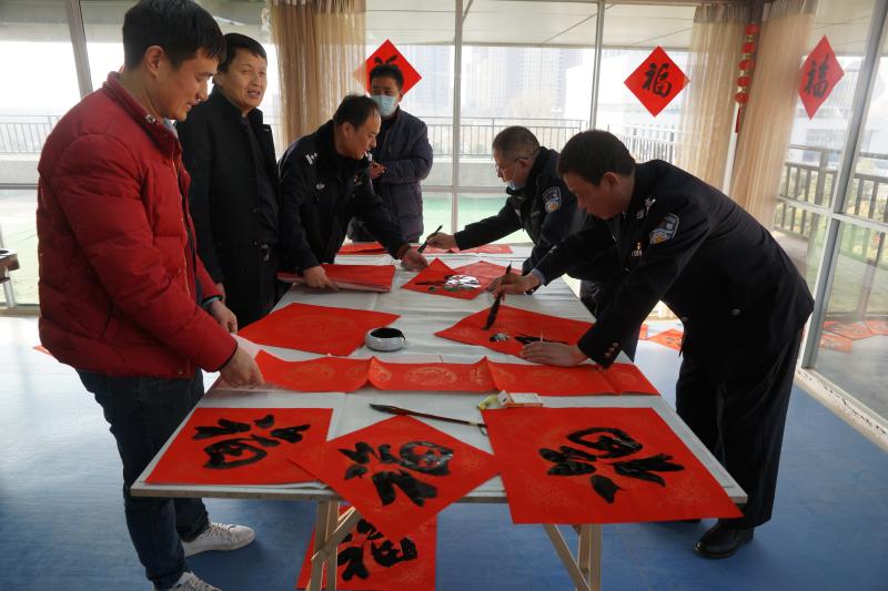 金牛賀歲來(lái)祥瑞,翰墨飄香迎新春。為弘揚(yáng)中華傳統(tǒng)文化,落實(shí)“從優(yōu)待警”舉措,傳遞市局黨委的親切慰問(wèn)和關(guān)心關(guān)懷,豐富警營(yíng)文化生活,營(yíng)造歡樂(lè)祥和的節(jié)日氛圍,2月9日,項(xiàng)城市公安局在三樓大廳開(kāi)展書(shū)贈(zèng)春聯(lián)活動(dòng),孫沄、閆永紅等5名警營(yíng)書(shū)法家及16名蓮溪書(shū)院師生揮毫潑墨,現(xiàn)場(chǎng)為民警、輔警及工作人員義寫(xiě)春聯(lián)、福字2000余套,受到了廣大民警、輔警的熱烈歡迎和充分好評(píng)。
