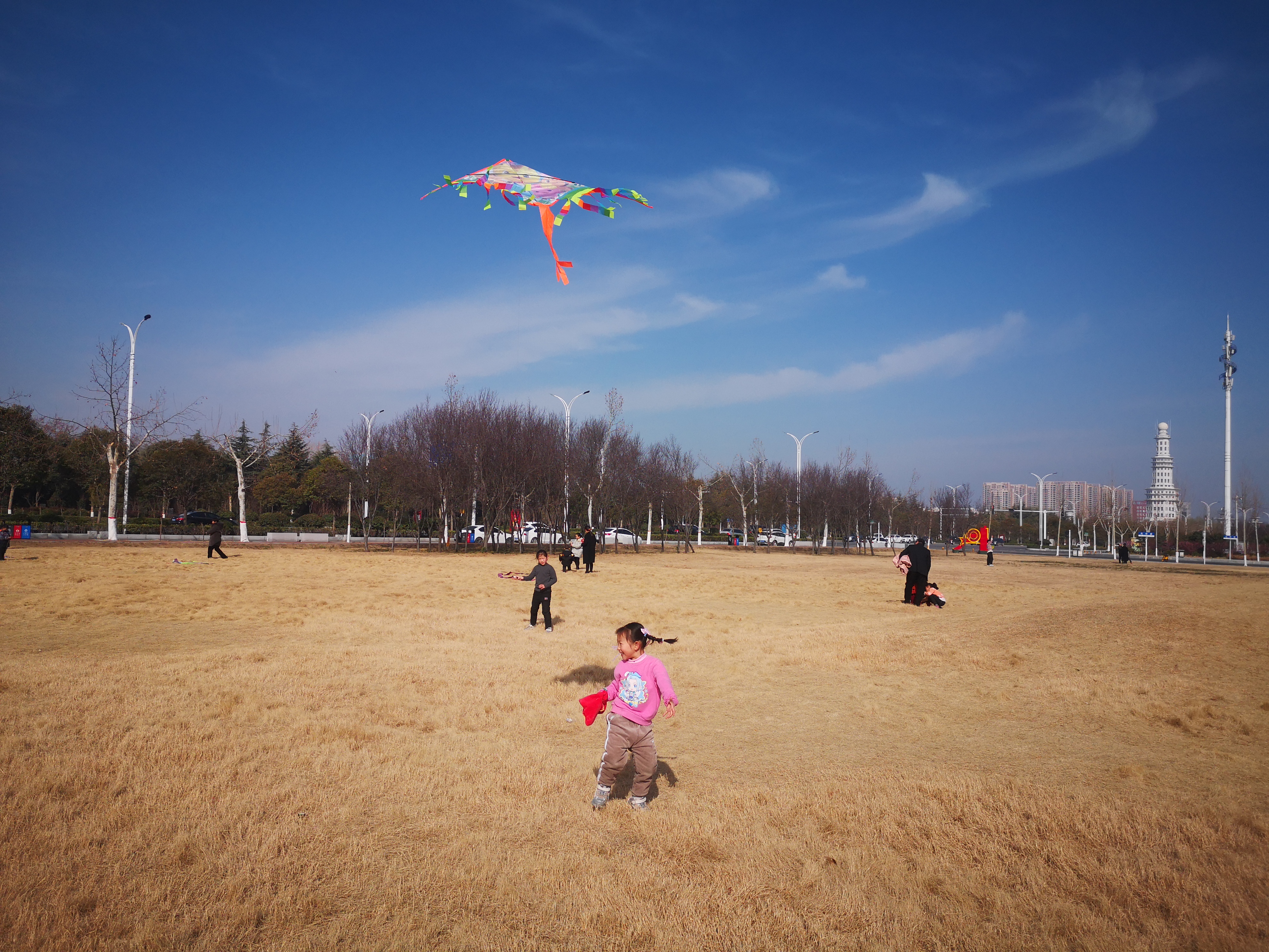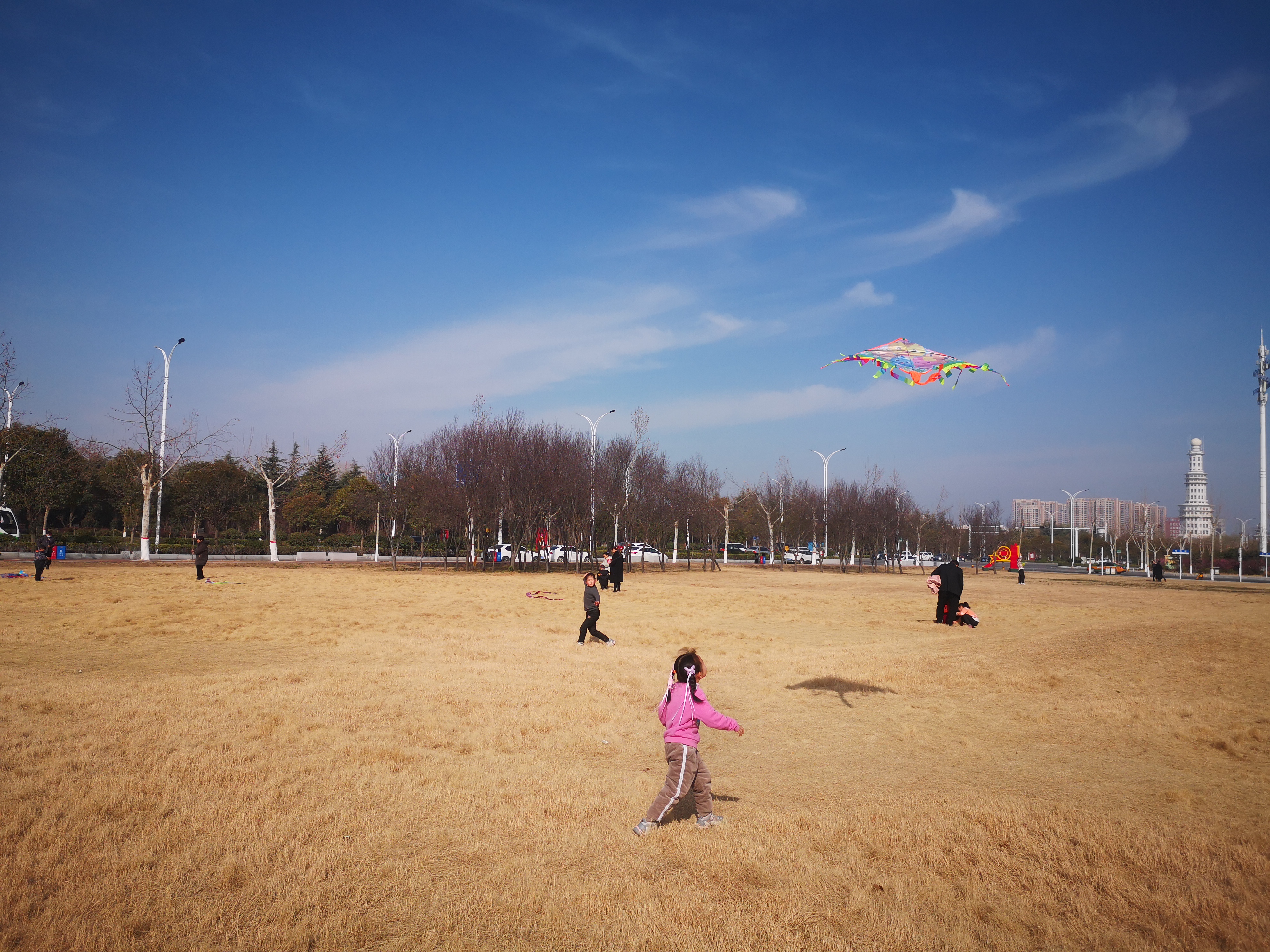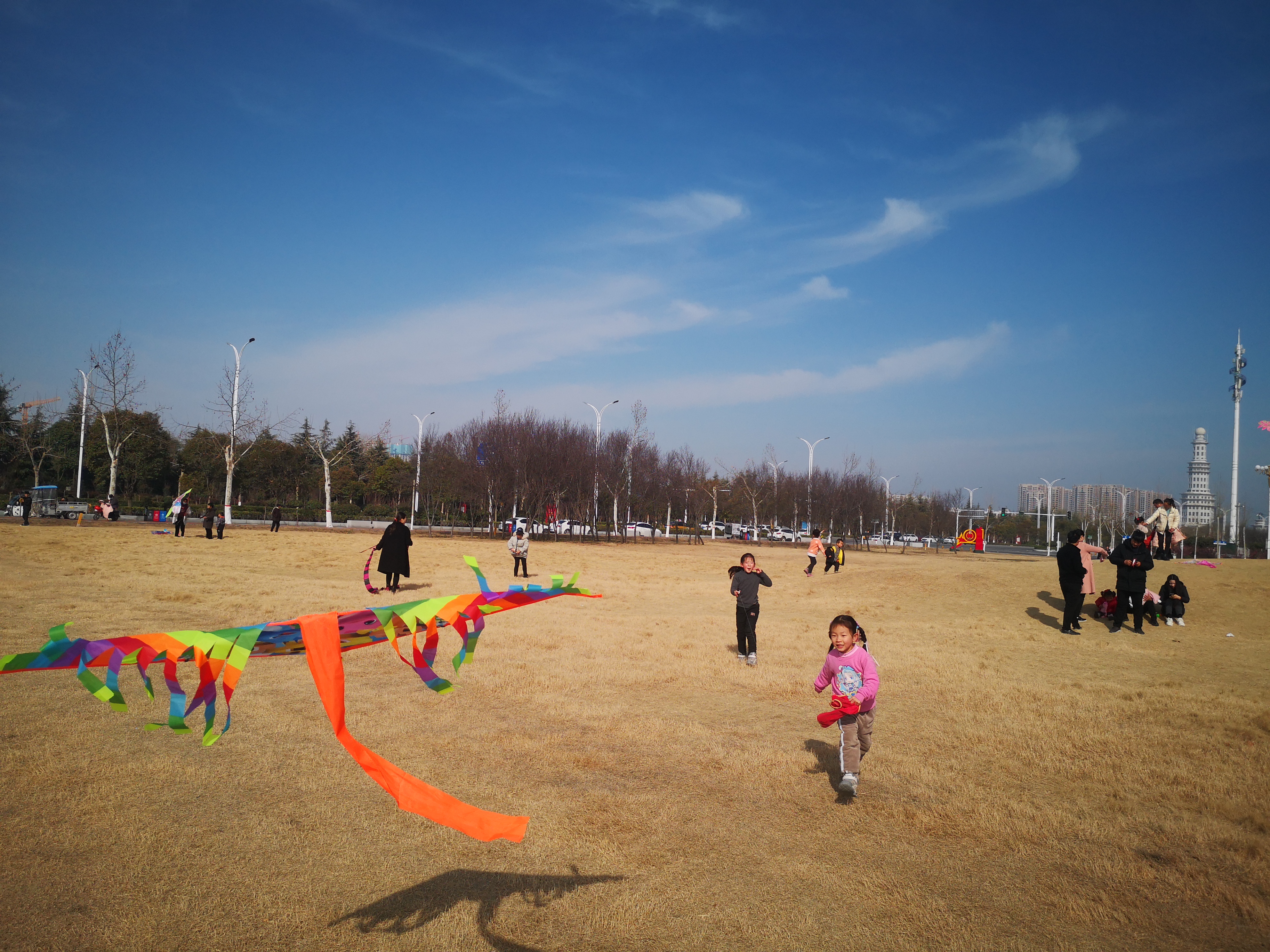 2月16日,周口大道旁邊的大草坪上,小朋友在放飛風箏。當日,藍天白云,春光正好,民眾樂享春節(jié)假日。