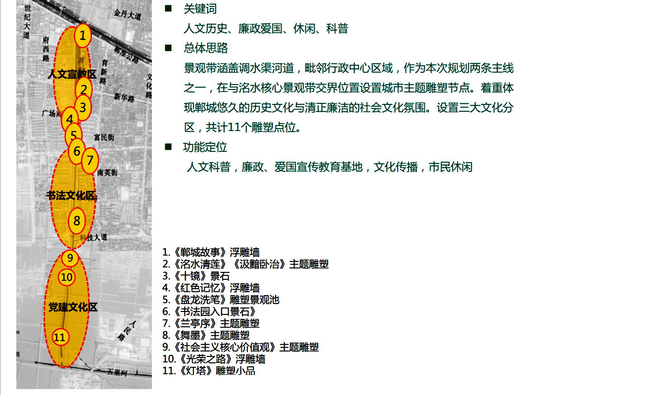 在縣委、縣政府綜合大樓東側(cè)的核心形象段,配合鄲城行政中心打造莊嚴(yán)、大氣氛圍的同時,對鄲城歷史文化進(jìn)行了集中展示,包括鄲城的歷史沿革,鄲城的發(fā)展理念,歷史故事等。其中調(diào)水渠西側(cè)以現(xiàn)有人民廣場對應(yīng)的綠地為基礎(chǔ),設(shè)置了較多的歷史文化節(jié)點。如調(diào)水渠新華路橋頭北側(cè)的廉政文化廣場,講述了漢朝名臣汲黯的故事。汲黯為人耿直,直諫廷諍,親政愛民,敢于承擔(dān)責(zé)任,漢武帝劉徹稱其為“社稷之臣”。汲黯廉政廣場建設(shè)在此處更有著深遠(yuǎn)的意義,它一方面提醒老百姓要了解歷史、敬畏先賢,同時也激勵著鄲城縣的各級黨員干部要在習(xí)近平新時代中國特色社會主義思想引領(lǐng)下,“不忘初心、牢記使命、廉潔奉公、一心為民”。