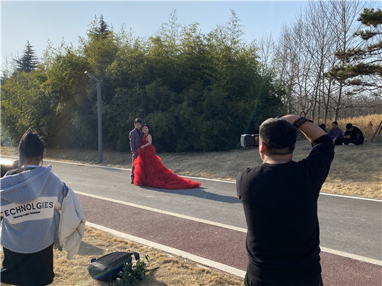 優(yōu)美的景色不是市民享受春光的好去處,也是拍攝婚紗照的好地方?!袄掀趴坷瞎稽c、再近一點,微笑、嗯不錯?!币粚π氯苏谂幕榧喺?,紅色的婚紗與自然的風景融在一起,盡顯新娘的美麗。在植物園里,拍一組森系風格的婚紗照很是漂亮,春風將“調(diào)色板”打翻,一對新人的甜蜜愛情就這樣被定格在這春天里。