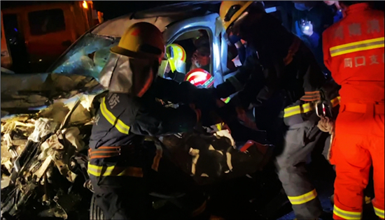 由于面包車內(nèi)有被困人員,需要消防救援人員到達(dá)現(xiàn)場使用專業(yè)破拆工具進(jìn)行救援。示范區(qū)消防大隊(duì)接警后立即調(diào)派2部消防車10名指戰(zhàn)員前往現(xiàn)場。指戰(zhàn)員到達(dá)現(xiàn)場后利用搶險(xiǎn)救援車對(duì)事故車輛進(jìn)行牽引,擴(kuò)大救援空間以便對(duì)被困司機(jī)進(jìn)行施救,同時(shí)利用破拆工具將面包車進(jìn)行破拆便于解救被困小女孩,當(dāng)晚8時(shí)39分,兩人被救出并移交于醫(yī)護(hù)人員接受進(jìn)一步治療。③5