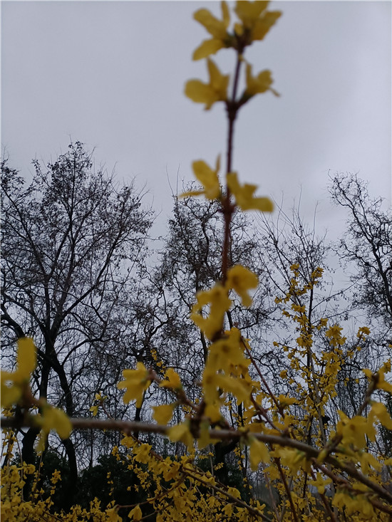 黃色的迎春花似云霞滿天,白色的玉蘭花婀娜多姿,紅色玉蘭含苞待放,即將飄零的臘梅老也留戀枝頭,舍不得離去,鮮艷的百花醉得垂柳在水面上扭起纖細(xì)的枝條。