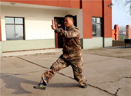 “班長王不老,向班長王學(xué)習(xí)。好!”準新兵們抱以雷鳴般的掌聲。掌聲未息,王成華虎虎生風(fēng)地打了一套軍旅拳:弓步?jīng)_拳、虛步砍肋、穿喉彈踢……擋擊絆腿、轉(zhuǎn)身別臂、擊腰鎖喉……每一個動作都顯得那么的到位,整套下來剛勁連貫、豪情奔放,王成華大氣不喘。