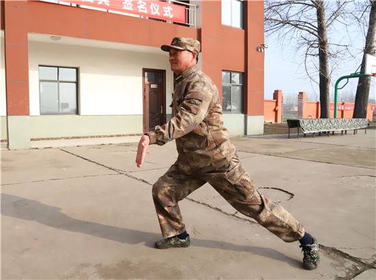 “立正!向右看齊!”3月4日,在鄲城縣民兵訓(xùn)練基地,2021年春季征兵預(yù)定新兵訓(xùn)練場上,53歲的訓(xùn)練班長王成華從骨子里喊出這句口號、集結(jié)準新兵隊伍。從1992年“鐵軍”127師退伍進入人武部至今,這句口號他已經(jīng)喊了29年,始終底氣十足。同事和準新兵們尊稱他為“班長王”。