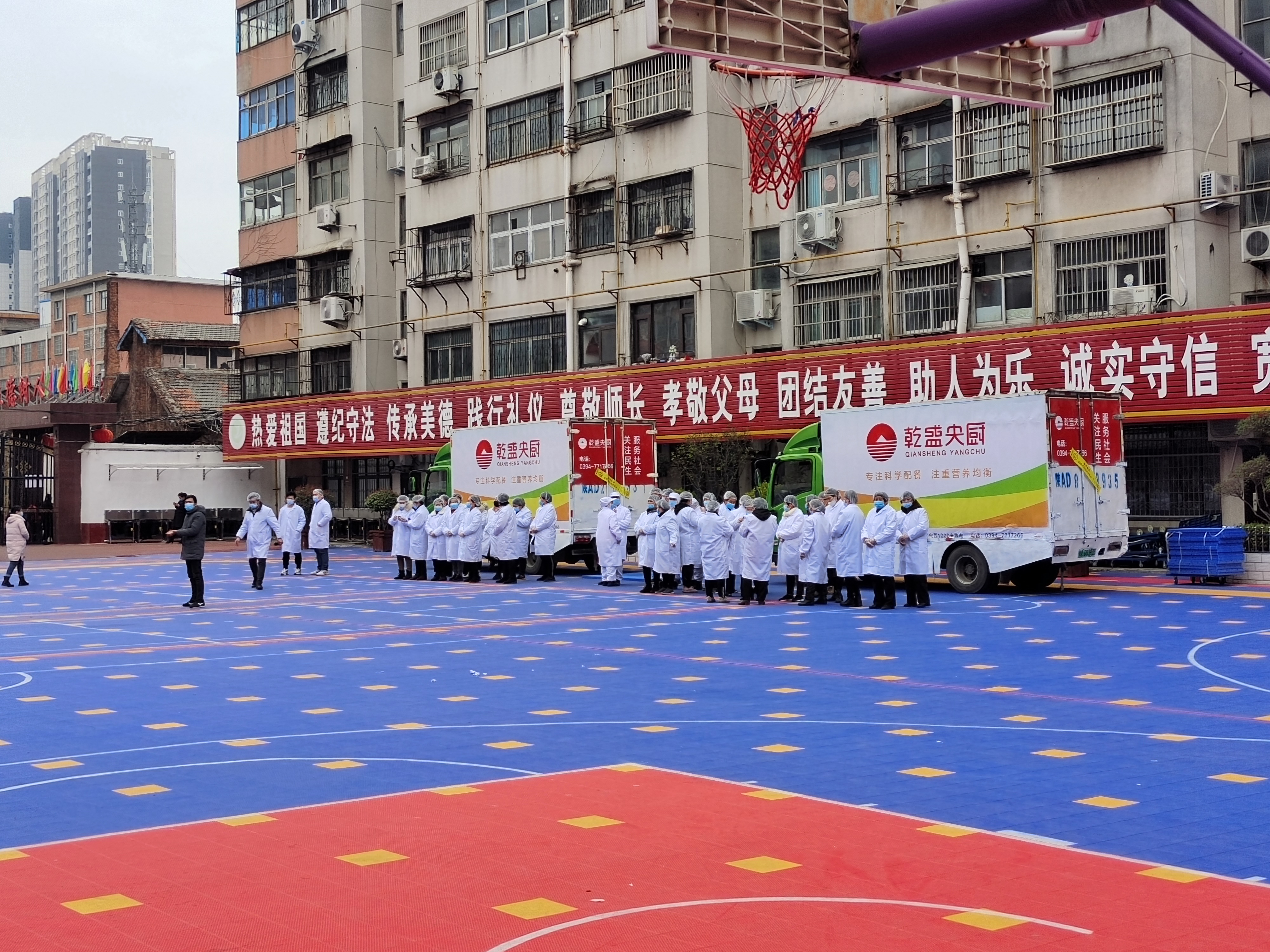 11時許,13000余份熱騰騰的飯菜即將送到周口市中心城區(qū)中小學(xué)生手中,直播團隊對七一路二小的配送情況進行現(xiàn)場直播。兩輛運餐大卡車,20余名工作人員整裝待發(fā),乾盛央廚鄭州總公司的營銷部負責(zé)人現(xiàn)場指揮調(diào)度七一路二小的發(fā)餐工作。揭掉卡車上的封條,留樣,測溫,裝車,按班分送,分發(fā)不銹鋼餐具,“哇!獅子頭!!”在孩子們的驚呼聲中,兩葷一素,一份米一份湯,熱氣騰騰地盛到孩子手中的餐具中?!昂⒆觽兂圆怀缘娘栄??”面對各直播平臺上網(wǎng)友的提問,乾盛央廚鄭州總公司營銷部負責(zé)人回答:“我們提前有準備,飯、菜我們都免費加,保證孩子們都吃飽,請家長朋友們放心。”