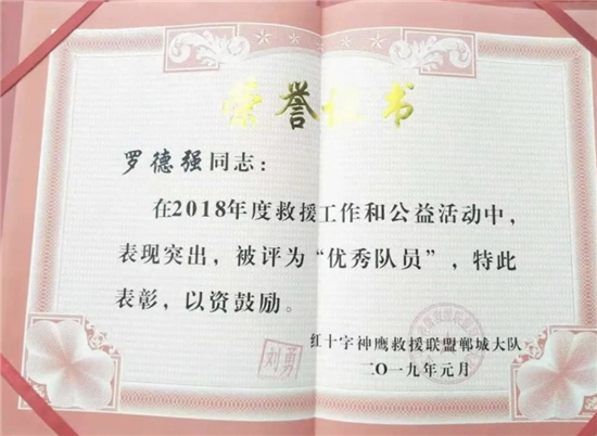 鄲城縣神鷹救援隊(duì)隊(duì)長(zhǎng)劉勇說(shuō),正是看到了羅德強(qiáng)的優(yōu)秀品質(zhì),2018年將羅德強(qiáng)吸納為神鷹救援隊(duì)員?!吧聱椌仍?lián)盟鄲城大隊(duì)隸屬于中國(guó)神鷹救援隊(duì),由各個(gè)行業(yè)的志愿者組成,也是河南省成立最早的一支民間救援隊(duì),除參加全國(guó)各地災(zāi)后救援活動(dòng)外,日常積極參加社會(huì)志愿者活動(dòng)?!薄拔乙粋€(gè)人的力量很有限,加入這個(gè)優(yōu)秀集體,能夠?qū)W到更多專業(yè)救援知識(shí),從而幫助更多的人,我感到非常驕傲和自豪?!绷_德強(qiáng)說(shuō)。2019年8月10日,受第九號(hào)臺(tái)風(fēng)“利奇馬”影響,山東省壽光市、東營(yíng)市等部分地區(qū)遭受洪災(zāi)。8月11日晚上,紅十字神鷹救援聯(lián)盟鄲城大隊(duì)趕赴山東壽光救災(zāi)。面對(duì)洪災(zāi),羅德強(qiáng)和其他救援隊(duì)員不畏辛苦,劃船深入各個(gè)受災(zāi)鄉(xiāng)村救助被困群眾。壽光市一鄉(xiāng)鎮(zhèn)3處大閘因斷電出現(xiàn)險(xiǎn)情,需要人力進(jìn)行開(kāi)閘泄洪。羅德強(qiáng)和隊(duì)員冒險(xiǎn)攀爬到大閘上進(jìn)行人工作業(yè),經(jīng)過(guò)3個(gè)多小時(shí)的奮戰(zhàn),3處大閘全部打開(kāi),安全泄洪。2019年9月1日,參加泳渡日月潭返程途中,羅德強(qiáng)在福建高速公路上,發(fā)現(xiàn)前方車輛發(fā)生車禍,一名司機(jī)腿部骨折、血流不止。他立即下車和司機(jī)溝通,一邊報(bào)警,一邊利用專業(yè)救援知識(shí)打開(kāi)變形的車門,順利將司機(jī)救出?!坝捎谶^(guò)度驚嚇,司機(jī)以骨折為由拒絕下車。當(dāng)我告訴司機(jī)自己是神鷹救援隊(duì)員、救援技術(shù)過(guò)硬后,才同意我們施救?!碑?dāng)時(shí)高速上車流密集,情況十分危險(xiǎn),如果司機(jī)不能及時(shí)救出,后果不堪設(shè)想?!拔覀冘囕v加油、住宿、吃飯等救援費(fèi)用都是隊(duì)員AA制負(fù)擔(dān),從來(lái)不給當(dāng)?shù)卣蚓戎颂砣魏温闊!?/p>