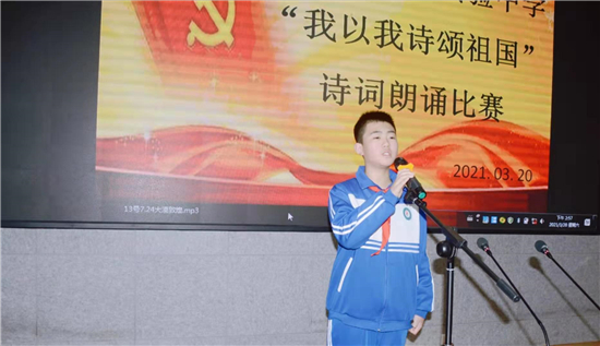 “我是你掛著眼淚的笑渦/我是新刷出的雪白的起跑線/是緋紅的黎明/正在噴薄/——祖國?。 币痪渚滹柡钋榈睦收b,一陣陣熱情如潮的掌聲。3月20日下午,鄲城縣第二實驗中學“我以我詩頌祖國”學生愛國詩詞朗誦比賽熱烈舉行。