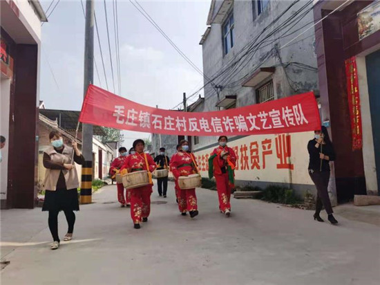 “父老鄉(xiāng)親聽我說,現(xiàn)在騙子真是多。莫占便宜要牢記,發(fā)家致富靠自己……”毛莊鎮(zhèn)石莊村這樣一支反電詐文藝宣傳隊瞬間吸引了人們的眼球。“現(xiàn)在我村的年輕人大部分都出去掙錢去了,在家的大部分是老人,我們幾個一合計把宣傳單上的內(nèi)容編成順口溜,這樣更好懂、更好記!”石莊村文藝宣傳隊的張秀芬笑著說。