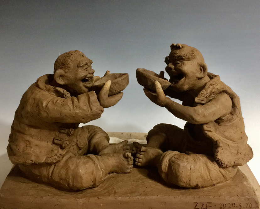隨后,張振福又介紹了近期創(chuàng)作的慶祝中國共產(chǎn)黨成立100周年紅色主題泥塑《征途漫漫》《長在黨旗下》《淮海戰(zhàn)役》《一個蘋果的故事》等。李尚武贊賞張振福泥塑風格獨特、主題鮮明,傳遞了正能量,作品具有思想性、藝術(shù)性,充滿鄉(xiāng)情味、泥土味。