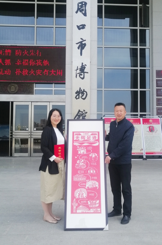 4月28日,河南科技職業(yè)大學(xué)老師范文華來(lái)到周口市博物館,將自己的剪紙作品“光輝足跡”捐贈(zèng)給周口市博物館,在建黨100周年之際,表達(dá)一位教育工作者的殷殷之情。周口市博物館館長(zhǎng)周建山向其頒發(fā)榮譽(yù)證書(shū)。