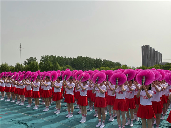 開幕式還舉行了彩扇舞、啦啦操、中國(guó)功夫、歌曲等文體表演。其中,彩扇舞《盛世花開》,由該校文化教育學(xué)院300名女生手持彩扇,跟隨著不同的音樂(lè)節(jié)奏變換著不同的色彩與隊(duì)形,依次拼出由鐮刀和錘頭組成的中國(guó)共產(chǎn)黨黨徽、象征體育精神的奧運(yùn)五環(huán)、“慶祝建黨100周年”、“周職20周年校慶”等圖形和字樣,表達(dá)著對(duì)黨的熱愛(ài)和對(duì)學(xué)校的祝福。表演者王真真說(shuō):“大家協(xié)同配合才能把節(jié)目表演好,這個(gè)節(jié)目我們排練了一個(gè)多月。雖然很辛苦,但是看到節(jié)目順利演出,感到很有成就感?!?/p>